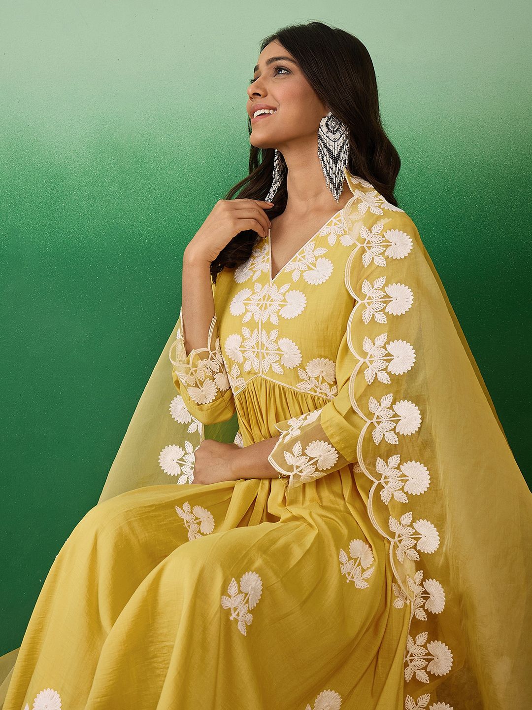 Dhiyona SN Women's Floral Embroidered V-Neck A-Line Kurta With Trouser & Dupatta