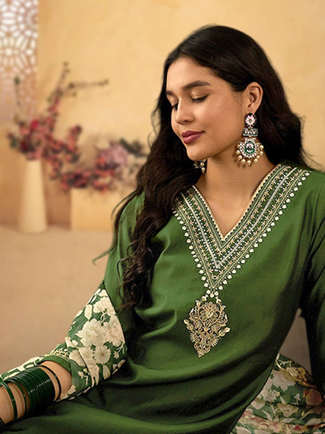 Dhiyona SN Women's Floral Yoke Design V-Neck Mirror Work Straight Kurta With Trouser & Dupatta