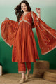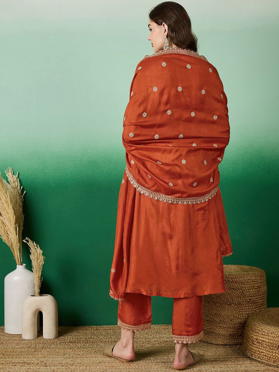 Dhiyona SN Women's Orange Floral Embroidered V-Neck Sequence Straight Kurta With Trousers & Dupatta