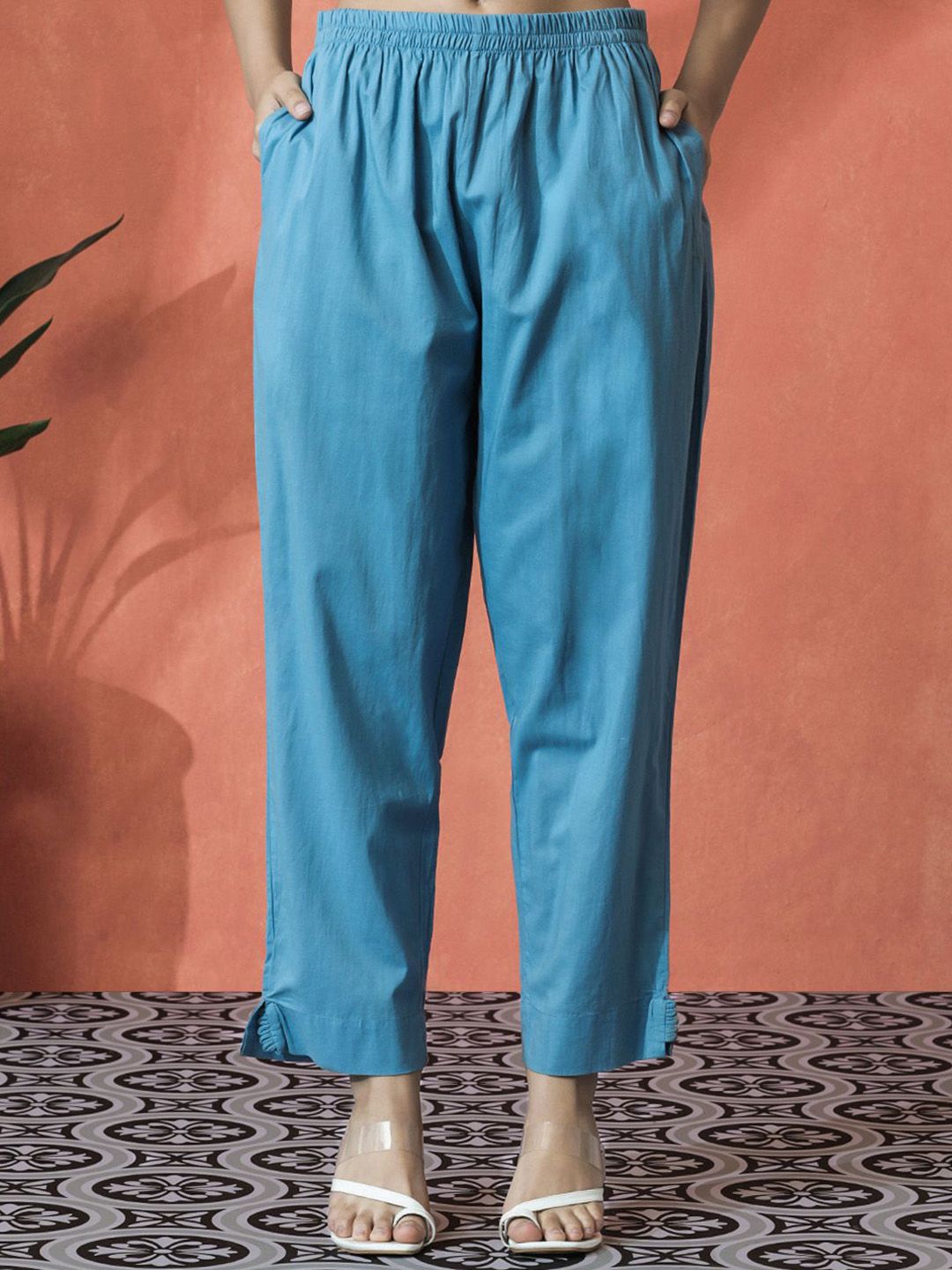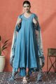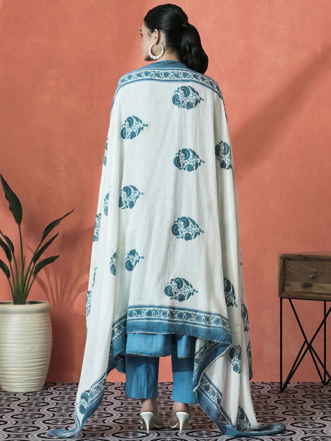 Blue, gold-toned and white solid kurta with trouser and dupatta