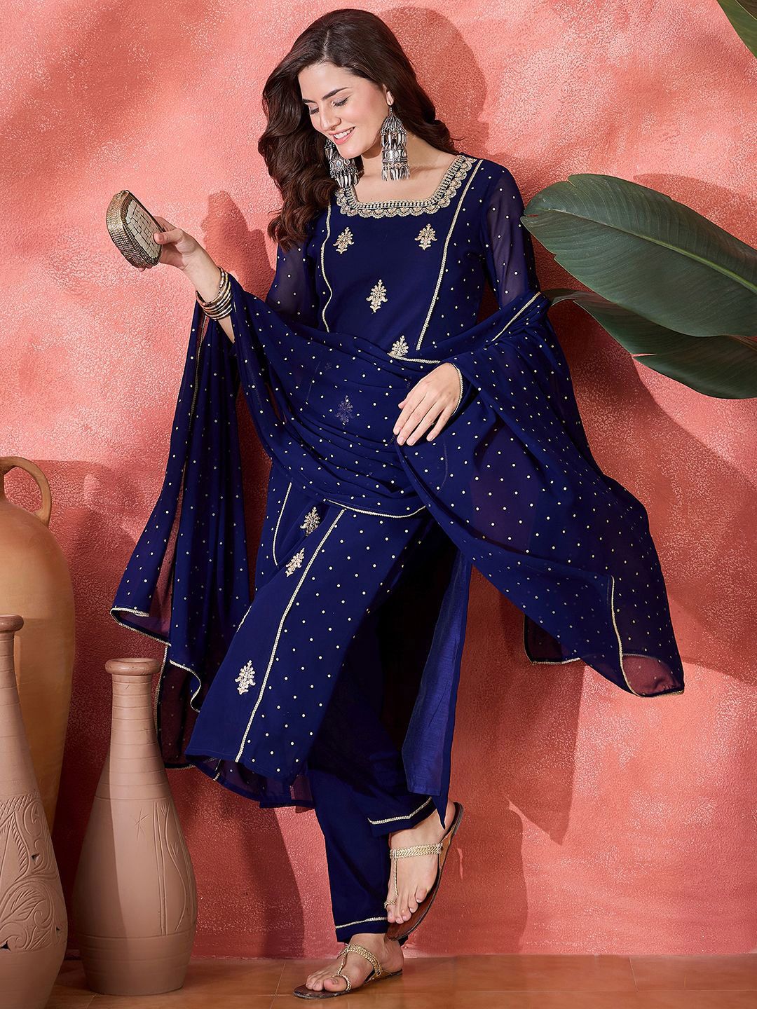 This kurta set consists of kurta and trousers with dupatta