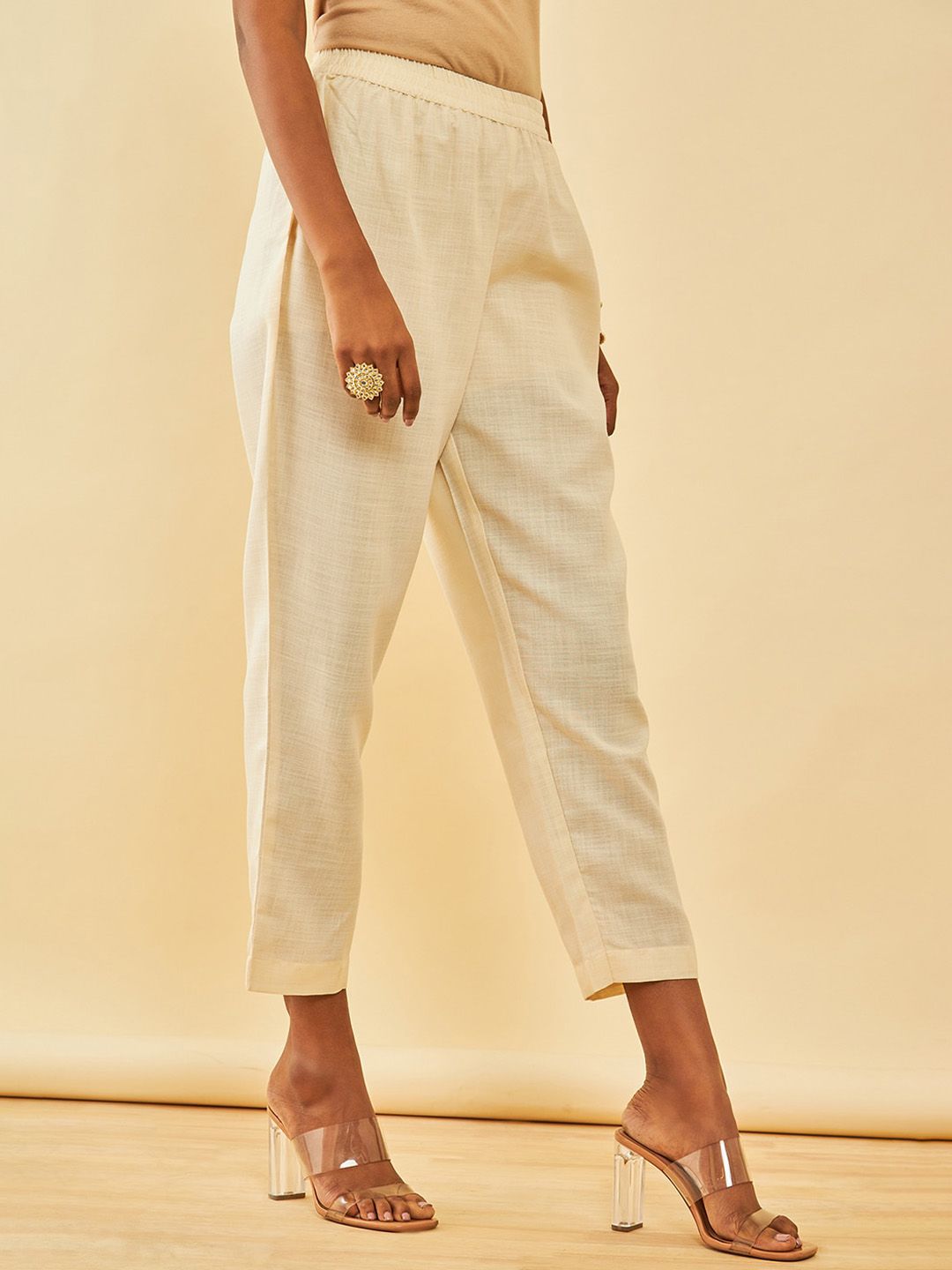 Dhiyona SO Women's Alina Cut Cream Ethnic Motifs Embroidered Thread Work A-Line Kurta With Trousers & Dupatta