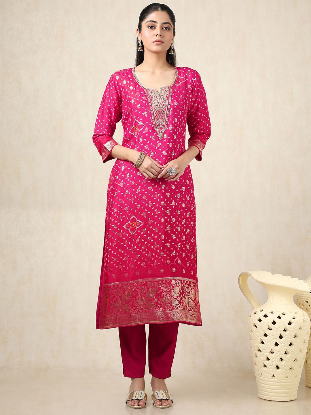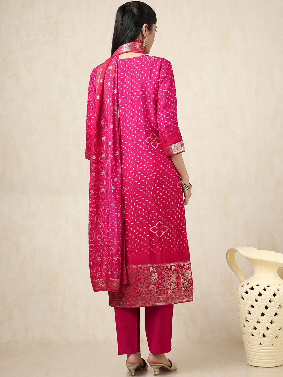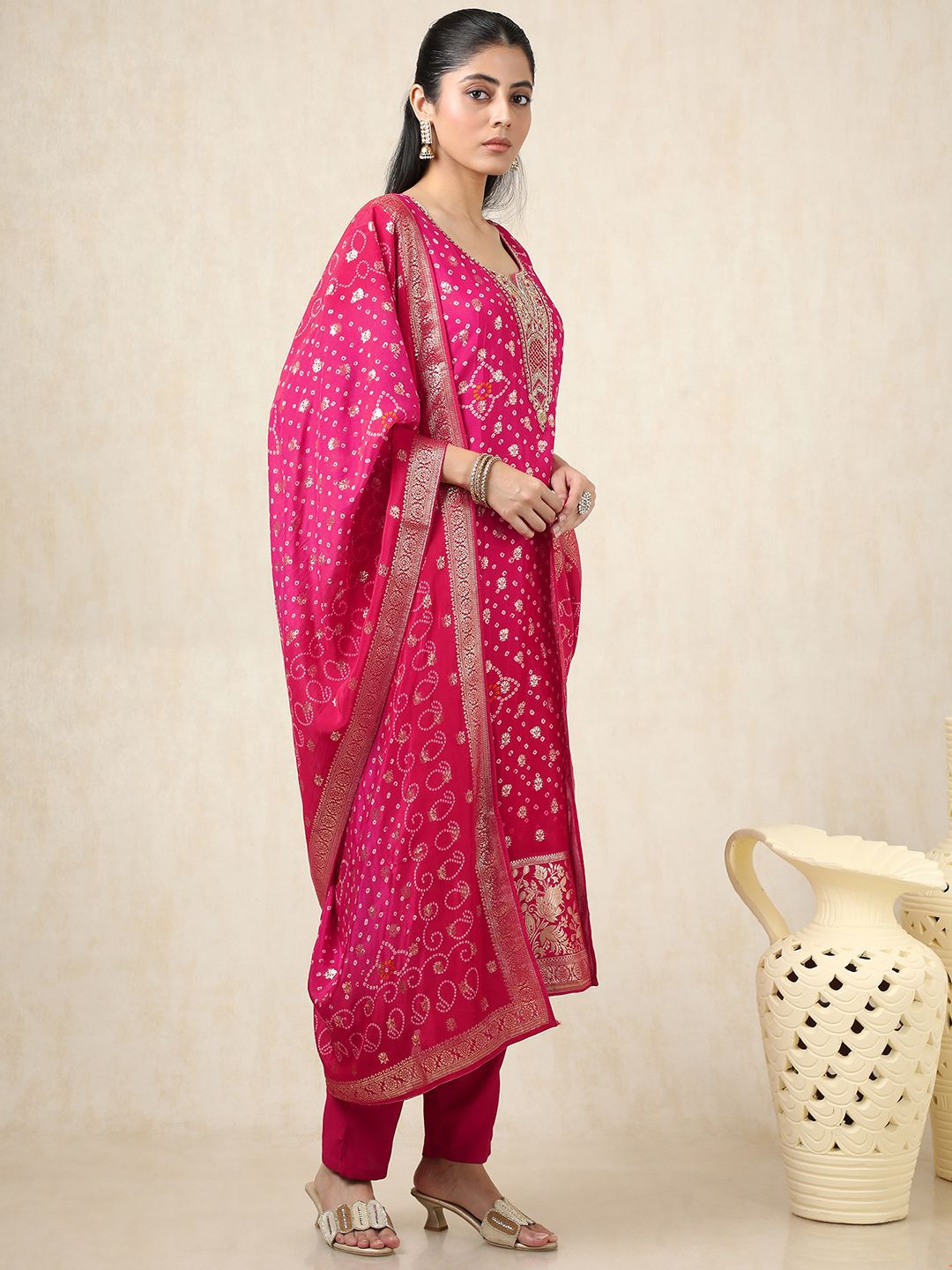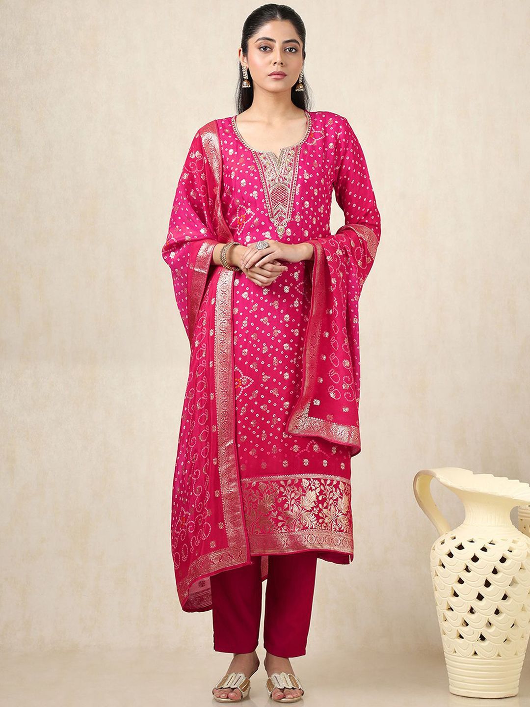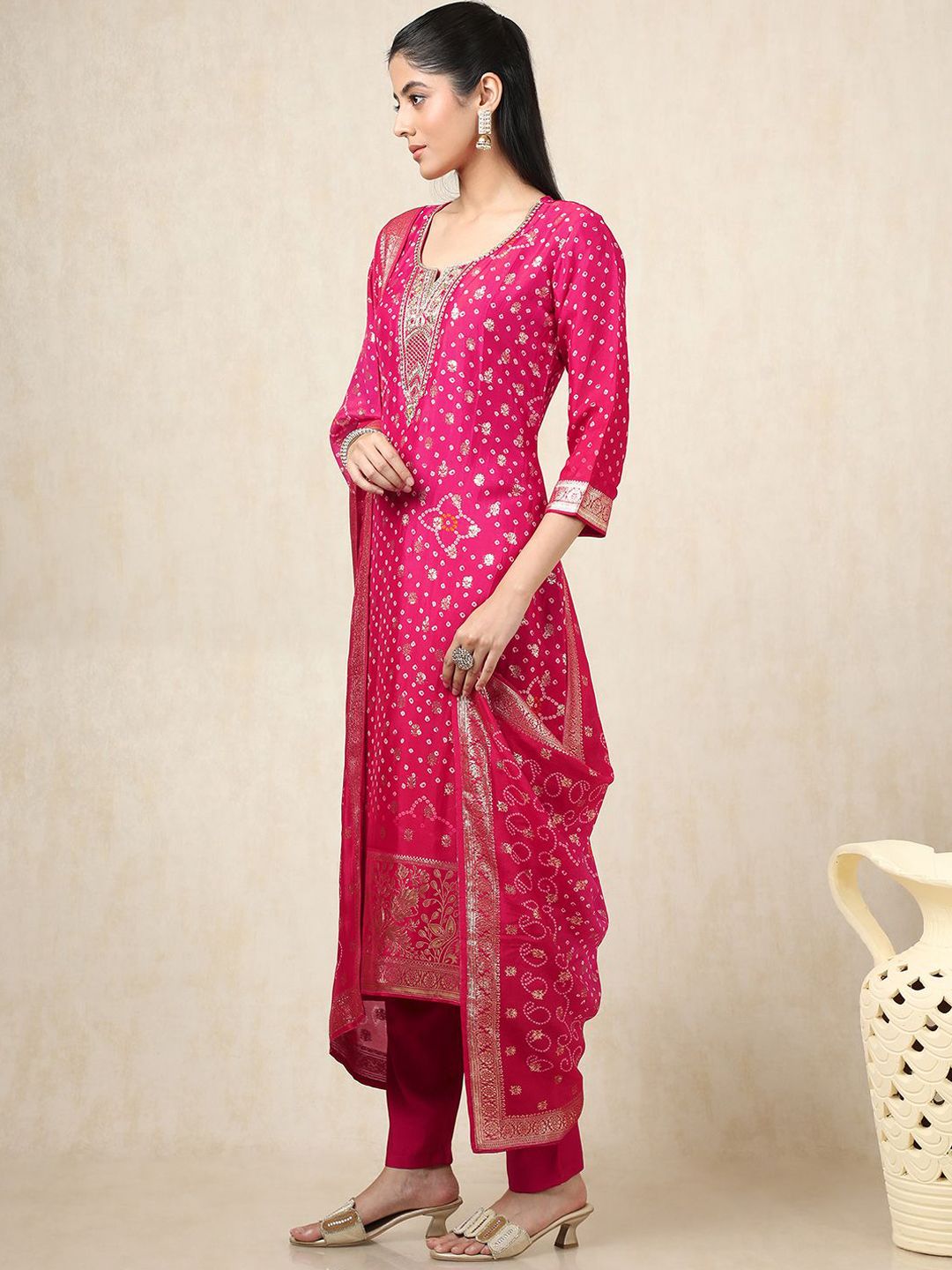 Dhiyona SO Women's Bandhani Printed Notch Neck Organza Sequinned Kurta With Trousers And Dupatta