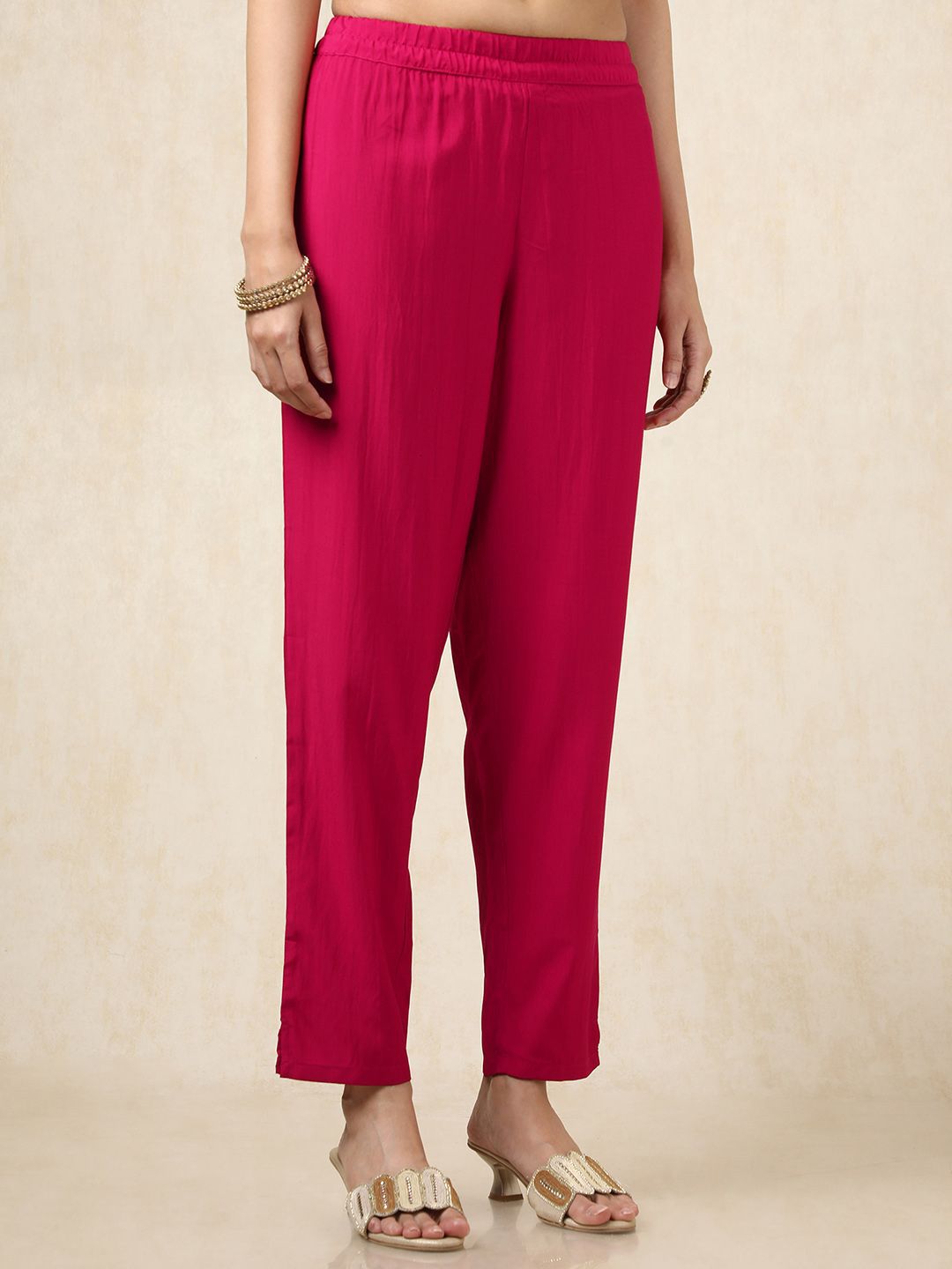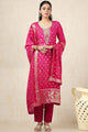 Fuchsia, white and gold toned printed kurta with trousers and dupatta