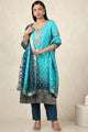 Turquoise blue, gold-toned and white printed Kurta with trouser and dupatta