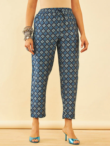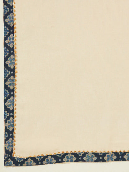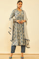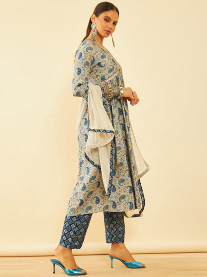 Dhiyona SO Women's Blue Paisley Printed Sequinned A-Line Kurta with Trousers & Dupatta