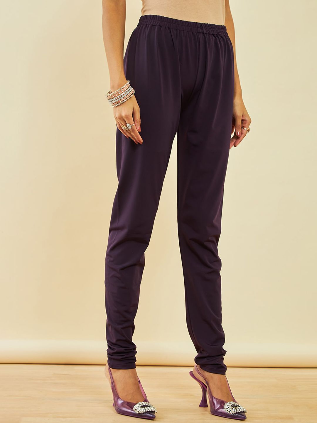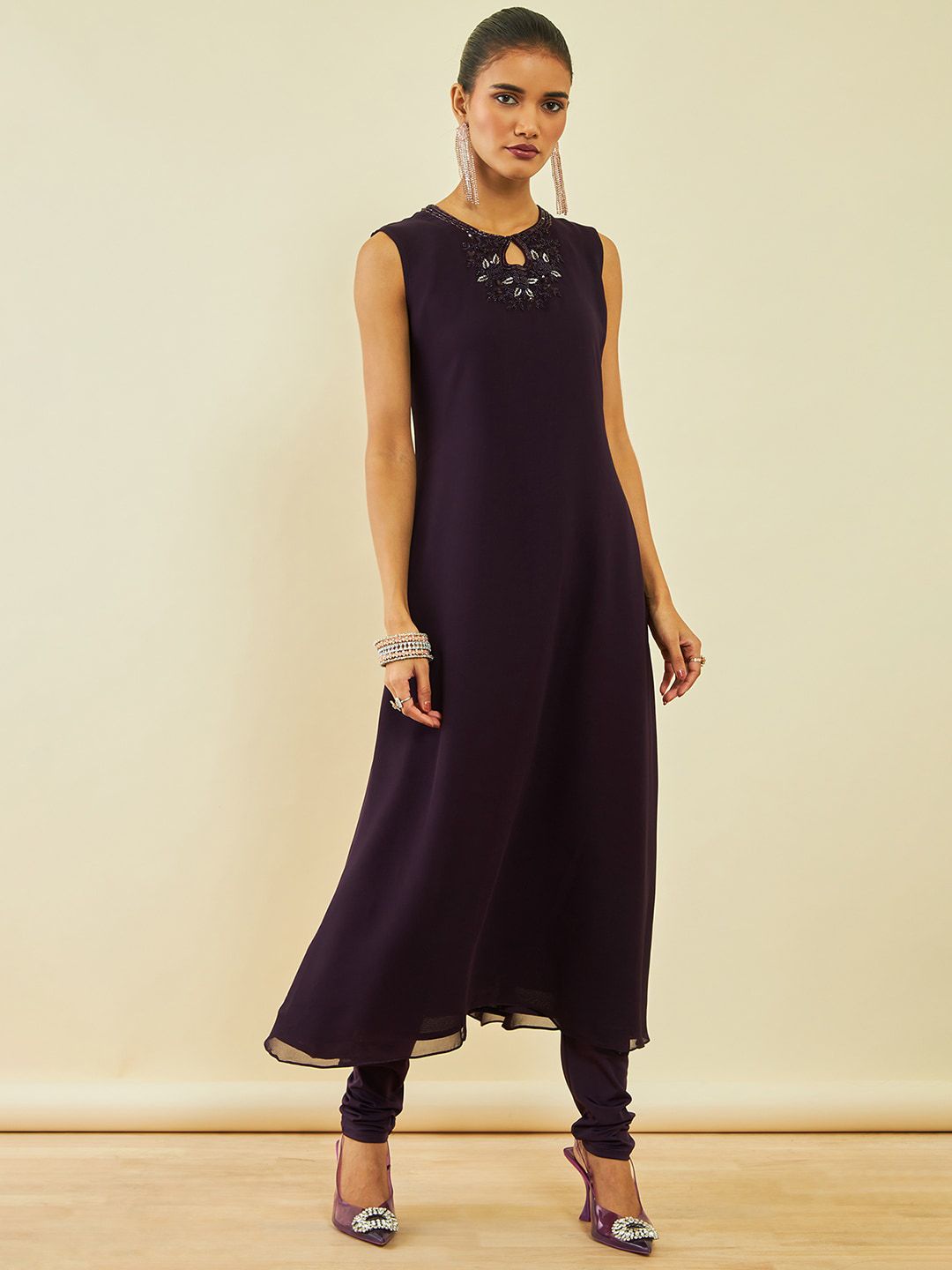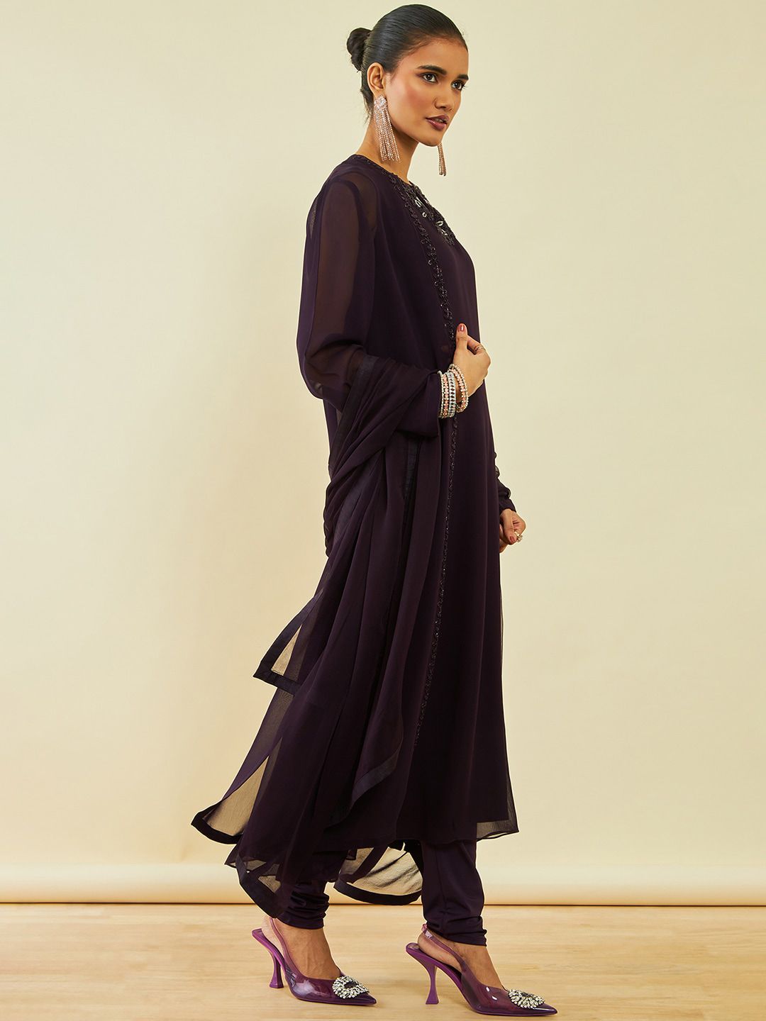 Dhiyona SO Women's Burgundy Embroidered Regular Beads and Stones Kurta with Churidar & Dupatta