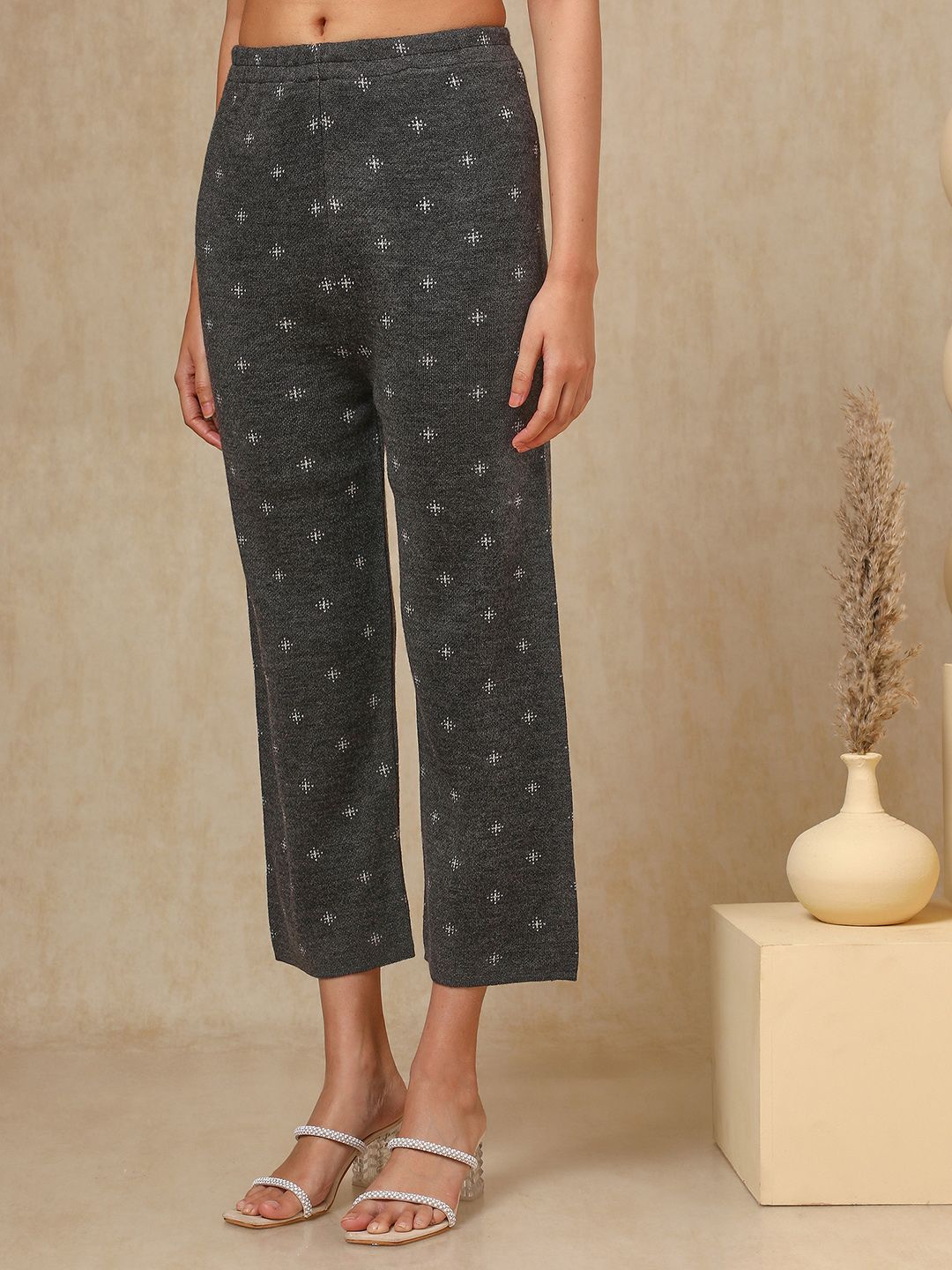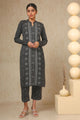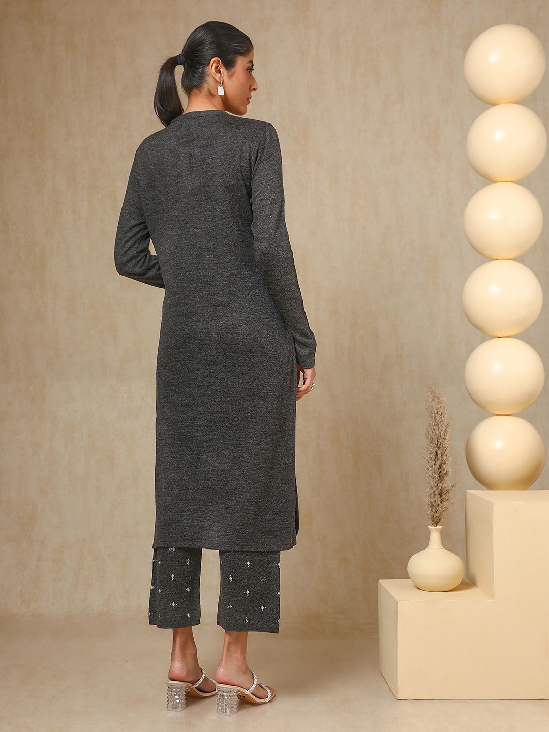Dhiyona SO Women's Charcoal Floral Woven Design Mandarin Collar Acrylic Straight Kurta With Trouser
