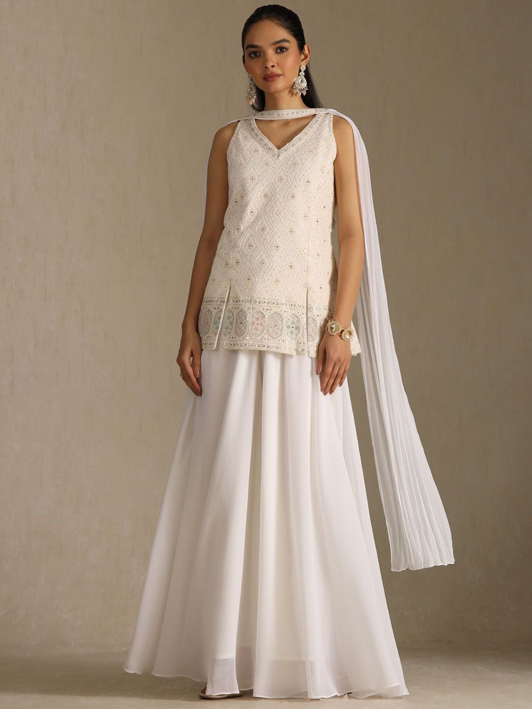 Dhiyona SO Women's Ethnic Motifs Embroidered V-Neck Mirror Work Georgette Kurta With Palazzos & Dupatta