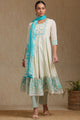 Teal blue and white self design kurta with trousers and dupatta