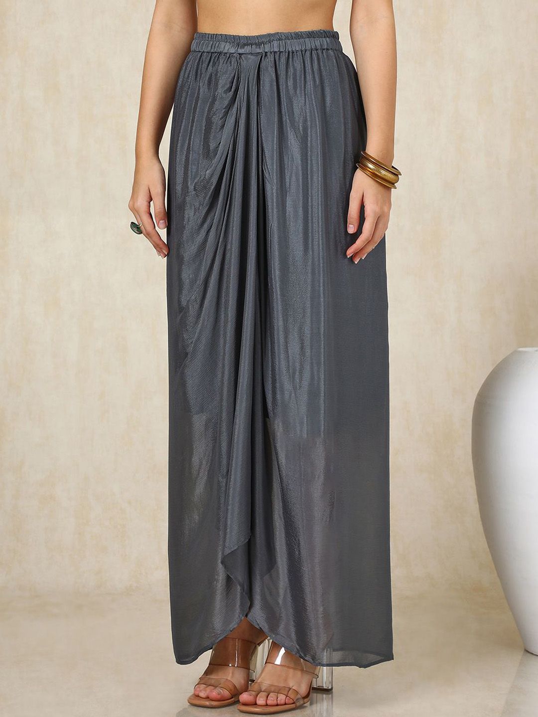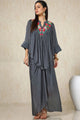 Dhiyona SO Women's Grey Floral Embroidered Mandarin Collar Three-Quarter Sleeves Top With Skirt