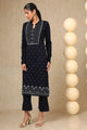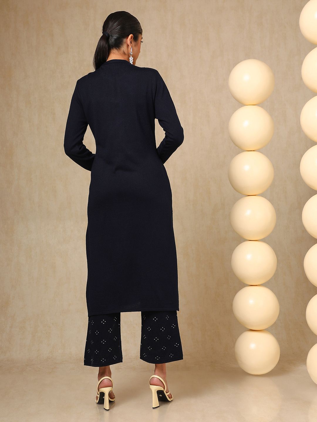 Dhiyona SO Women's Navy Blue Floral Woven Design Mandarin Collar Acrylic Straight Kurta With Trouser