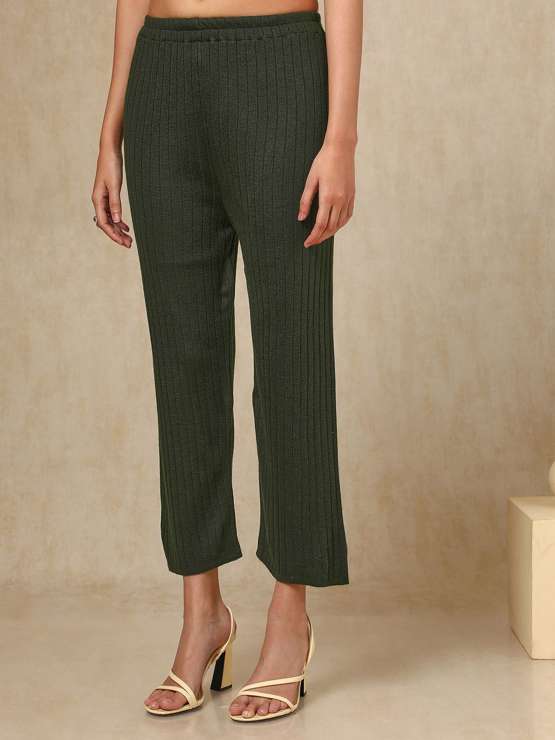 Dhiyona SO Women's Olive Green Paisley Woven Design Mandarin Collar Acrylic Straight Kurta With Trouser