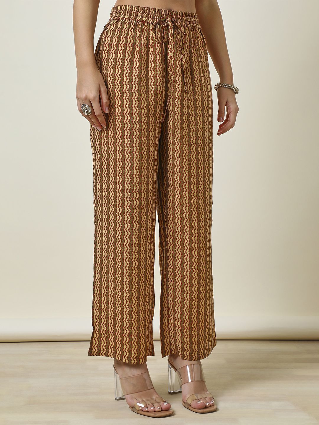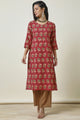 Dhiyona SO Women's Red Floral Embroidered Round Neck Straight Mirror Work Kurta With Palazzos