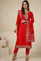 Dhiyona SO Women's Red Floral Printed Round Neck Regular Thread Work Kurta With Trouser With Dupatta