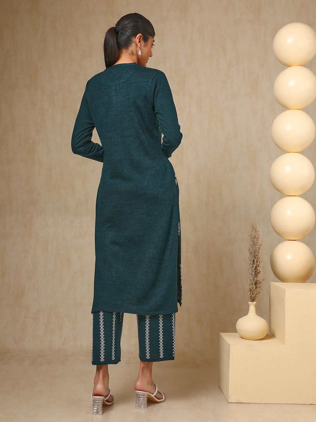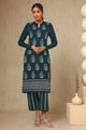 Dhiyona SO Women's Teal Green Paisley Woven Design Mandarin Collar Acrylic Straight Kurta With Trouser