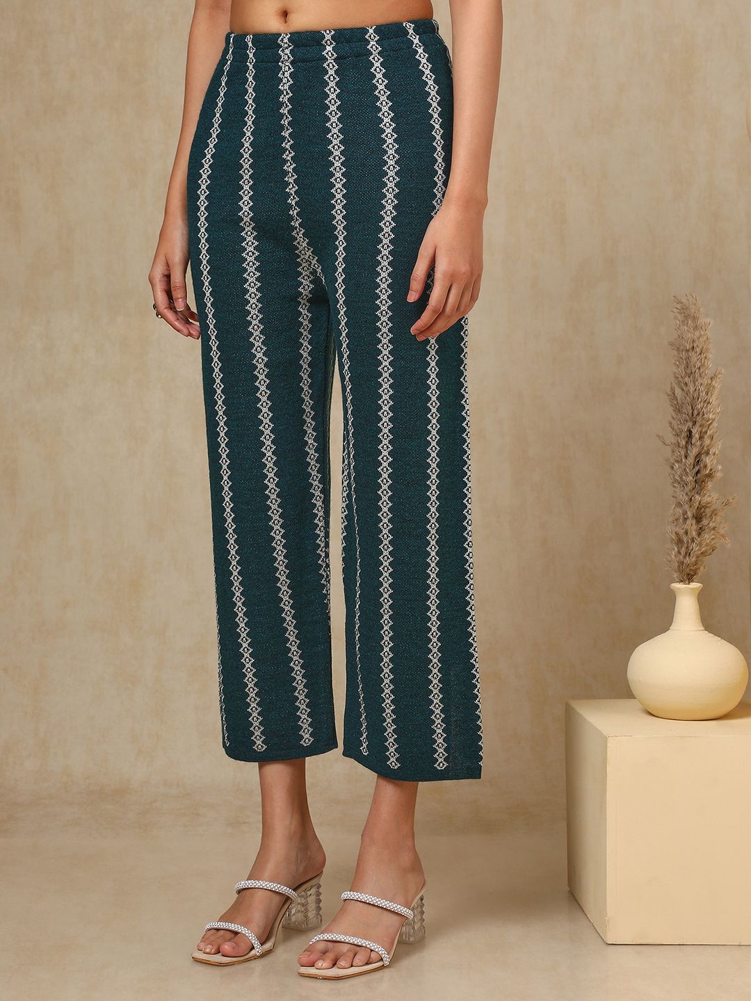 Teal green and white woven design kurta with trouser