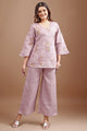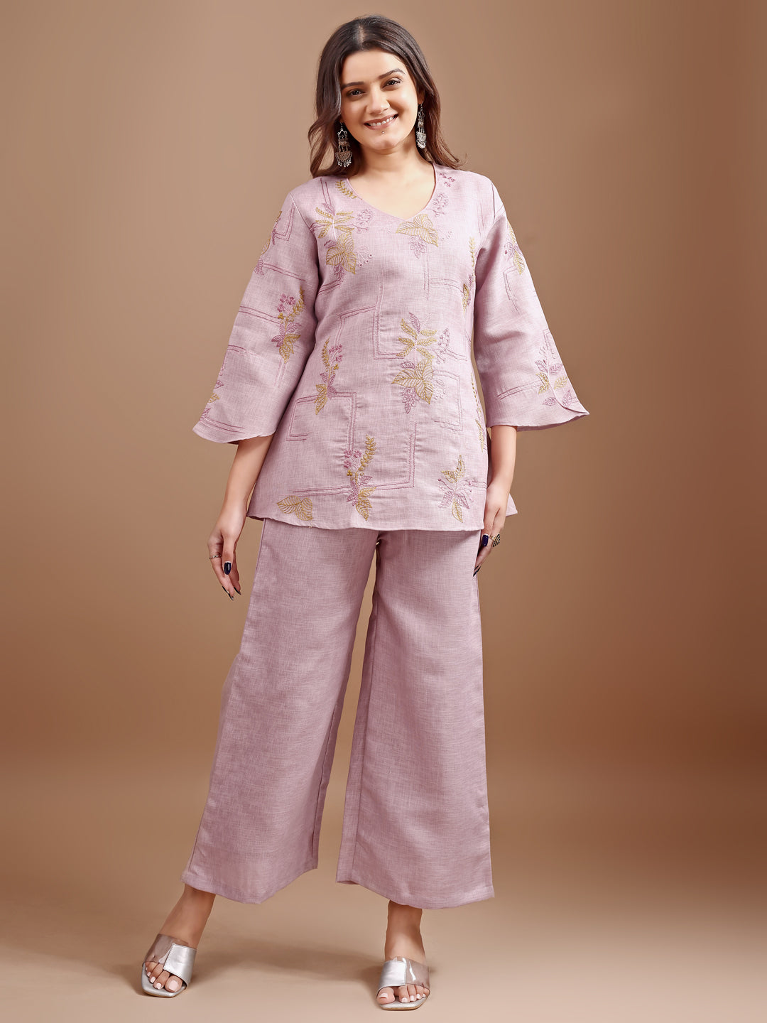 Dhiyona TI Women's Mauve Linen Contrast Thread Embroidery Top with Palazzo