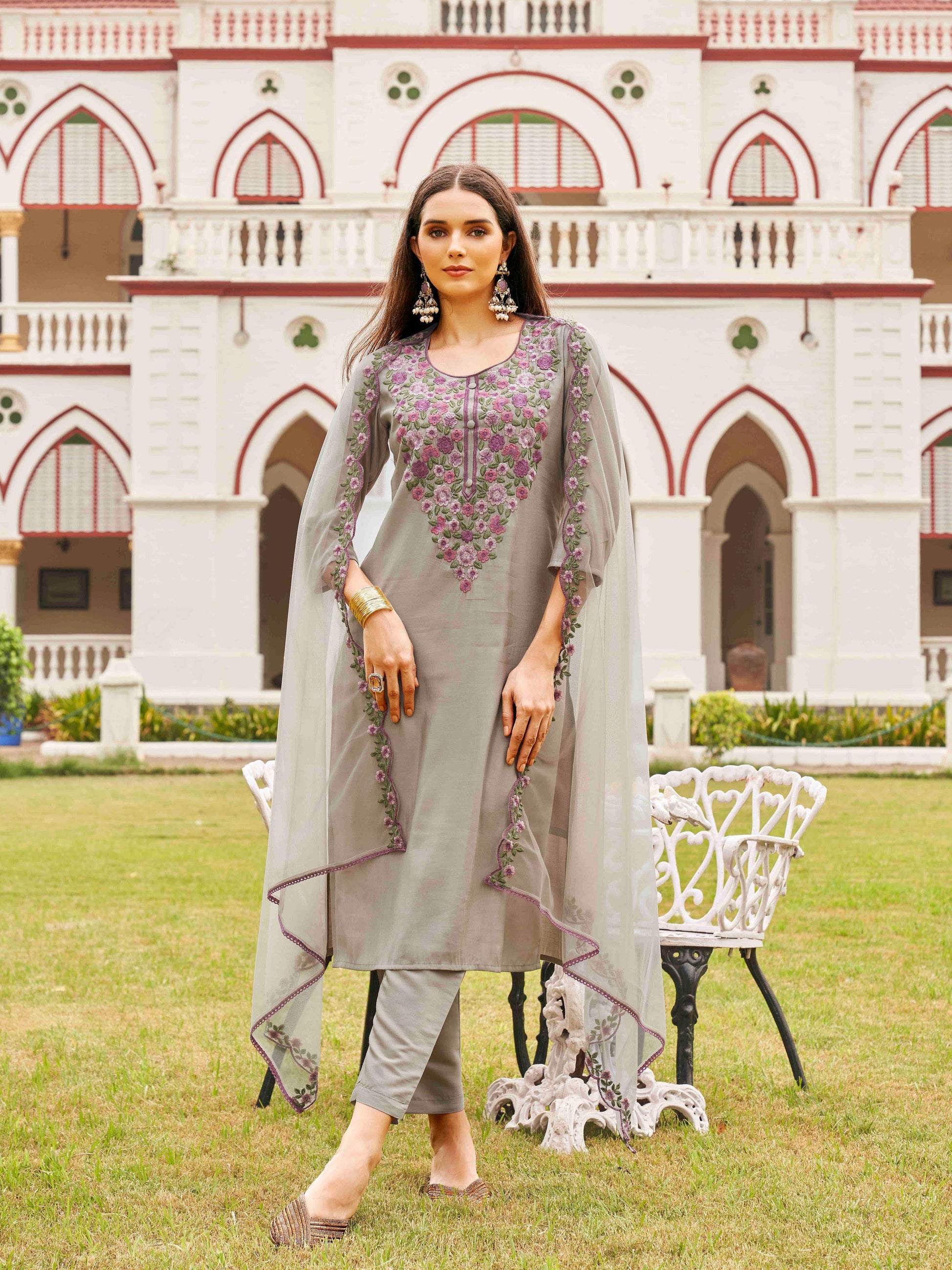 Dhiyona TI Women's Silk Blend Multi Thread Straight Cut Kurta with Pant and Dupatta