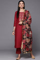maroon embroidered kurta with digital printed dupatta and straight pant,straight kurta,thread yoke embroidery,round neckline,dobby fabric kurta,3/4th sleeves