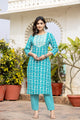 Dhiyona VR Women's Blue Printed Round Neck Yoke Embroidered Kurta Paired With Bottom And Dupatta
