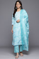 Dhiyona VR Women's Blue Printed Round Neck Yoke Embroidered Straight Kurta With Bottom And Dupatta