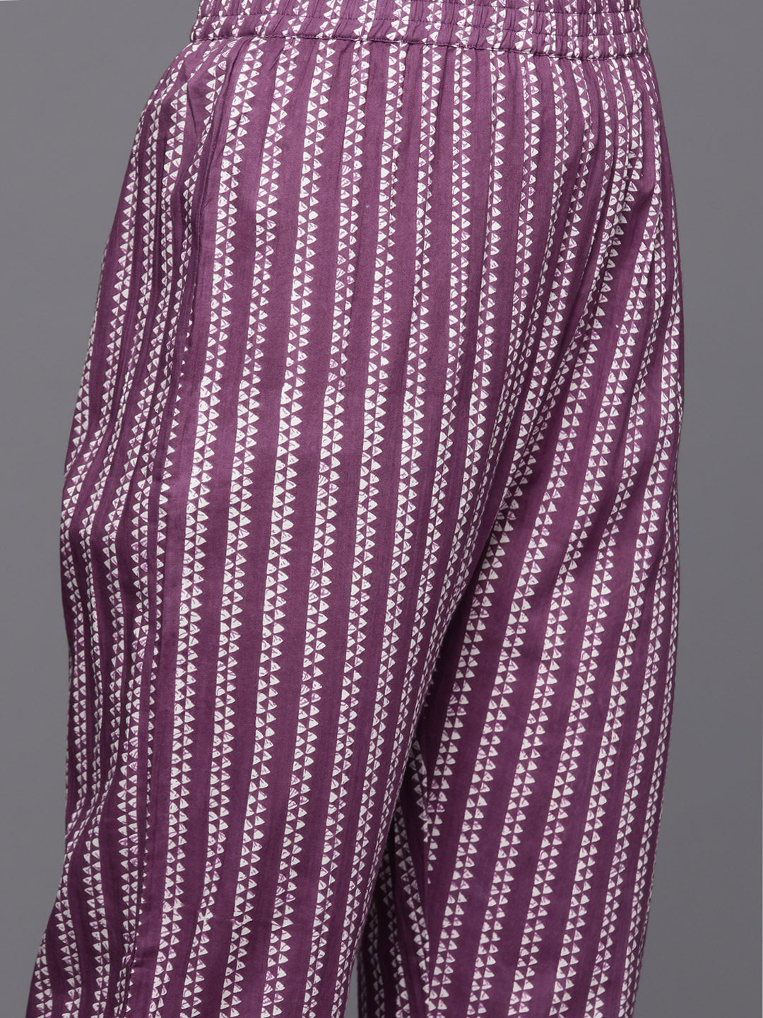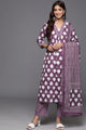 Purple Floral Printed V-Neck With Lace Detail, Three Quarter Sleeves With Lace Detail, Gather Detail At Empire Line, Straight Kurta With Side Slits.
