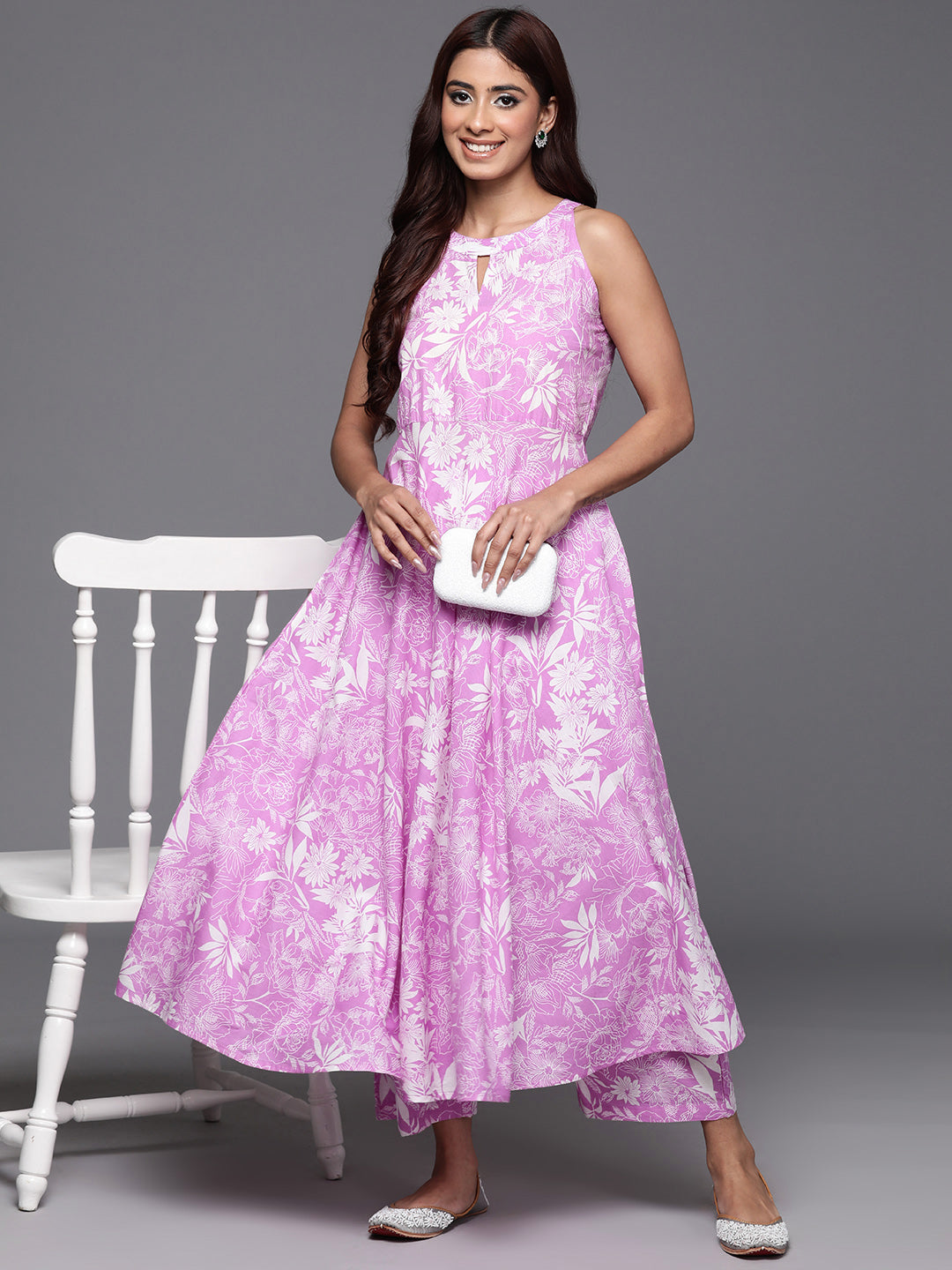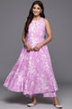 Lavender Floral Printed Halter Neck Sleeveless Anarkali Kurta Paired With Tonal Printed Bottom