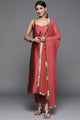 Maroon Embroidered, Three Quarter Sleeves, Round Neck With Slit, Embellished With Thread Work Yoke With Side Slits Straight Kurta Paired With Thread Work Hem Bottom And Four Sided Cotton Fringed Lace Dupatta