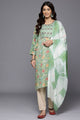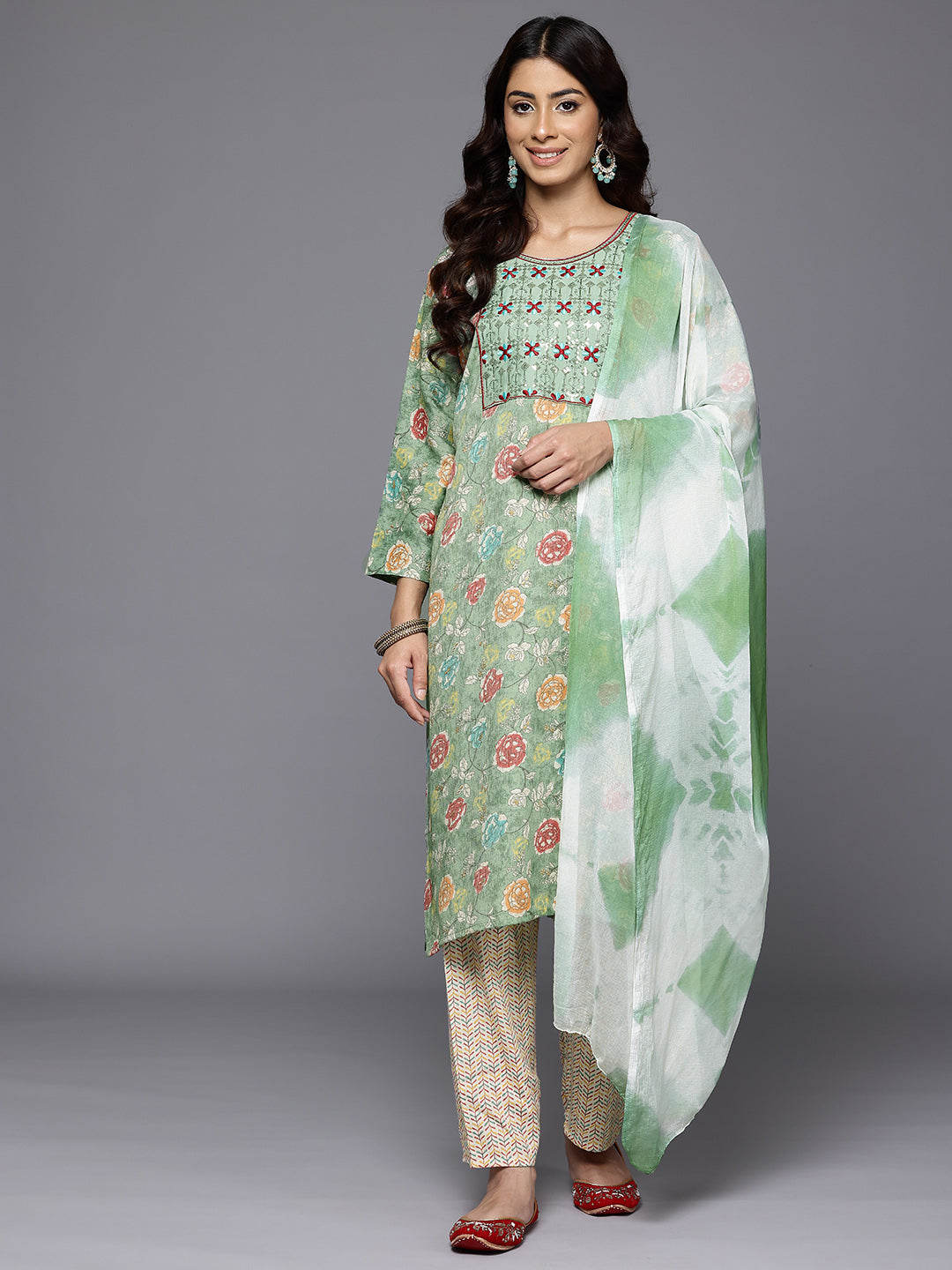 Dhiyona Mint Green Round Neck Embroidered Yoke Printed Kurta Paired With Printed Bottom & Tie-Dye Dupatta