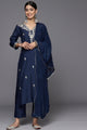 Dhiyona Navy Blue Placement Design Zari Embroidered Kurta Paired With Tonal Bottom And Tonal Chiffon Dupatta