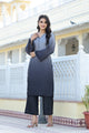 Ombre Grey V Neck With Lace Detailed, Long Flared Sleeves A-Line Kurta With Side Slit Paired With Botttom