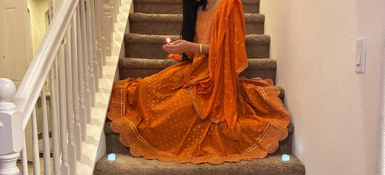 Dhiyona VR Women's Orange Mirror And Thread Embroidered,Zari Embellished Scalloped Schiffli Anarkali Kurta Paired Wirh Printed Bottom And Embroidered Dupatta