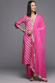 Pink Pure Fabric, Lehariya Embroidered Round Neck, Three Quarter Sleeves Straight Kurta With Gota Border Paired With Tonal Bottom And Solid Dupatta