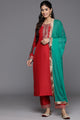 Dhiyona VR Women's Red Embroidered Straight Kurta Paired With Tonal Bottom And Contrast Dupatta With Four Sided Fringes