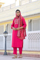 Fuchsia Pink Round Neck Zari And Gotta Patti Embroidered Yoke, Sequins And Beads Embellished Kurta, Three-Quarter Sleeves Paired With Bottom And Printed Dupatta