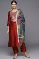 Maroon Round Neck Yoke Embroidered, Three Quarter Sleeves, Straight Kurta Paired With Tonal Solid Bottom And Printed Dupatta