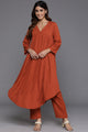 Rust V-Neck, Three Quarter Sleeves, Empire Gathered Details A-Line Kurta Paired With Tonal Bottom