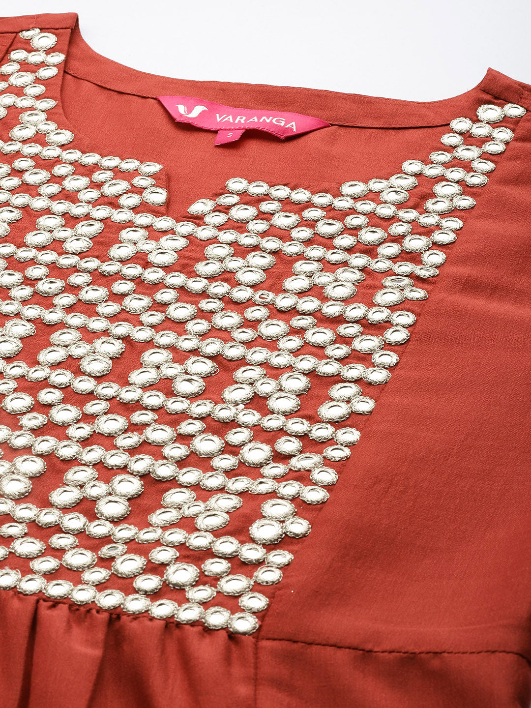 Dhiyona VR Women's Rust Mirror Work Yoke Embroidered Straight Kurta Paired With Tonal Bottom And Tonal Solid Dupatta With Four Side Fringes
