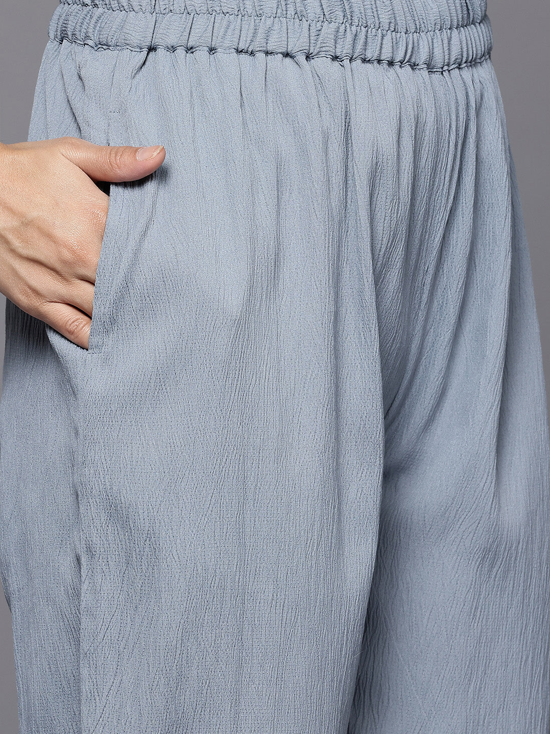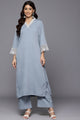 Grey Thread Embroidered Organze Detailed V Neck, Three Quarter Sleeve Straight Kurta Paired With Tonal Bottom With Organza Hem