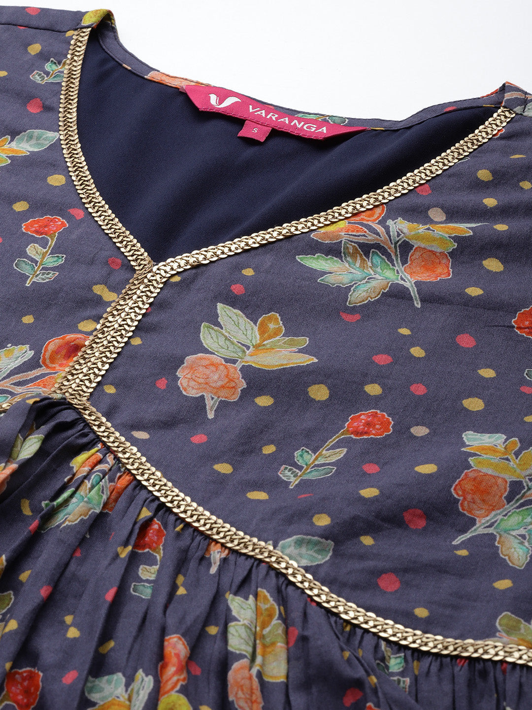 Violet Floral Printed A-Line Kurta, V-Neck Sequin Embellished, Three Quater Sleeves, Paired With Tonal Bottom And Chiffon Solid Dupatta,