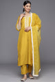 Yellow Round Neck, Three Quarter Sleeves, Yoke And Sleeve Hem Embroidered With Thread And Mirror, Straight Kurta Paired With Tonal Solid Bottom And Tonal Sequins Embroidered Dupatta