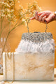 Bold and whimsical, this box clutch pairs sparkling diamond embellishments with soft white feathers for a dramatic, high-glam finish. The structured silhouette opens to a single main compartment with a secure click closure, while the wrist loop ensures easy carry during cocktail nights, receptions, or red carpet moments. Style it with metallic gowns, feathered sarees, or fusion wear to make a statement that's equal parts luxe and playful.