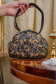 A striking blend of celestial charm and regal flair, this black and gold-toned half moon clutch curves into a silhouette that's both elegant and edgy. Intricate embroidery and embellishments shimmer across its crescent form, while the twist closure secures a roomy main compartment--ideal for festive essentials or cocktail edits. The shoulder strap adds hands-free ease, making it a versatile pick for sangeet nights, reception looks, or gifting in luxe hampers.