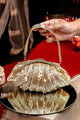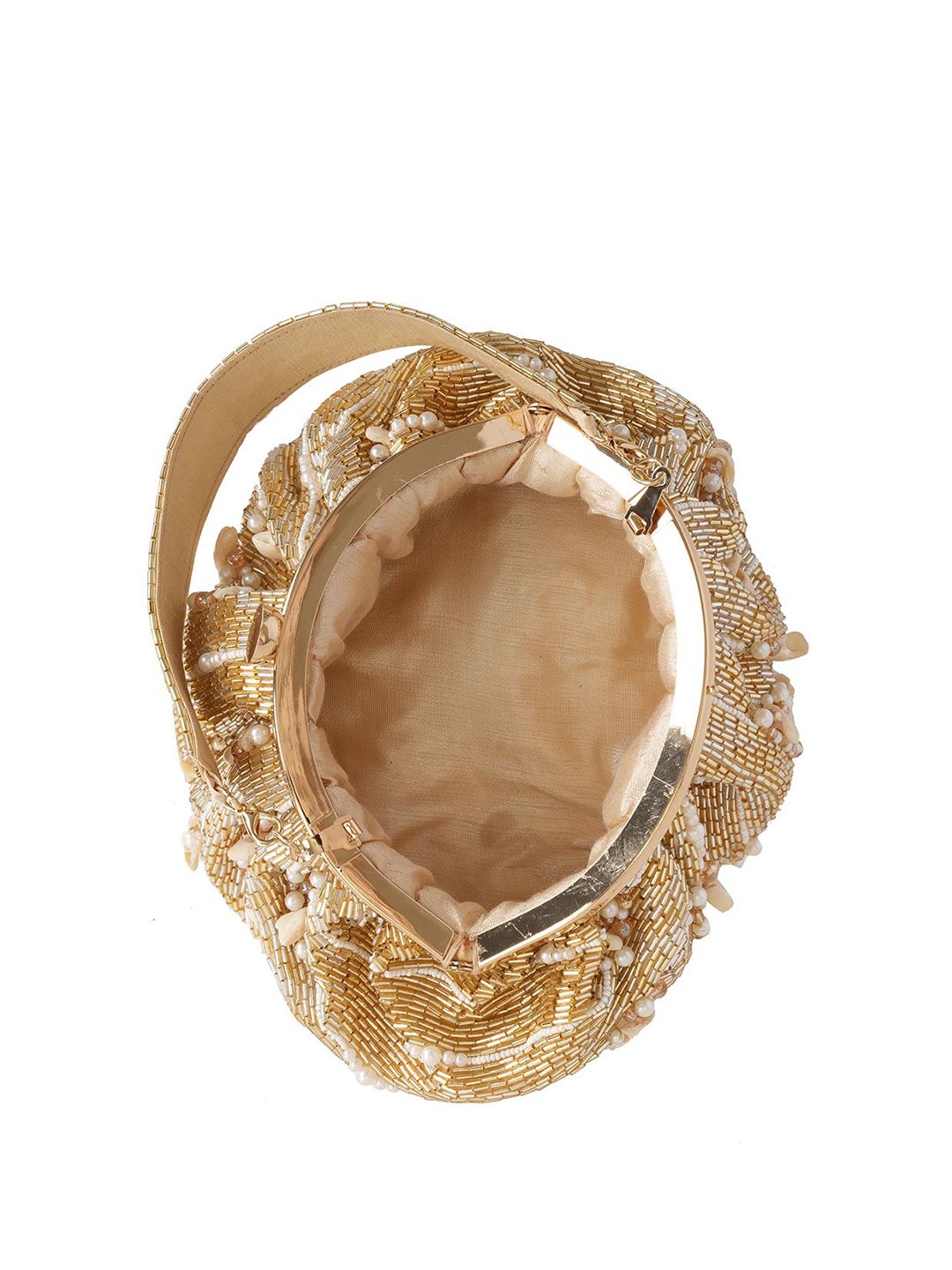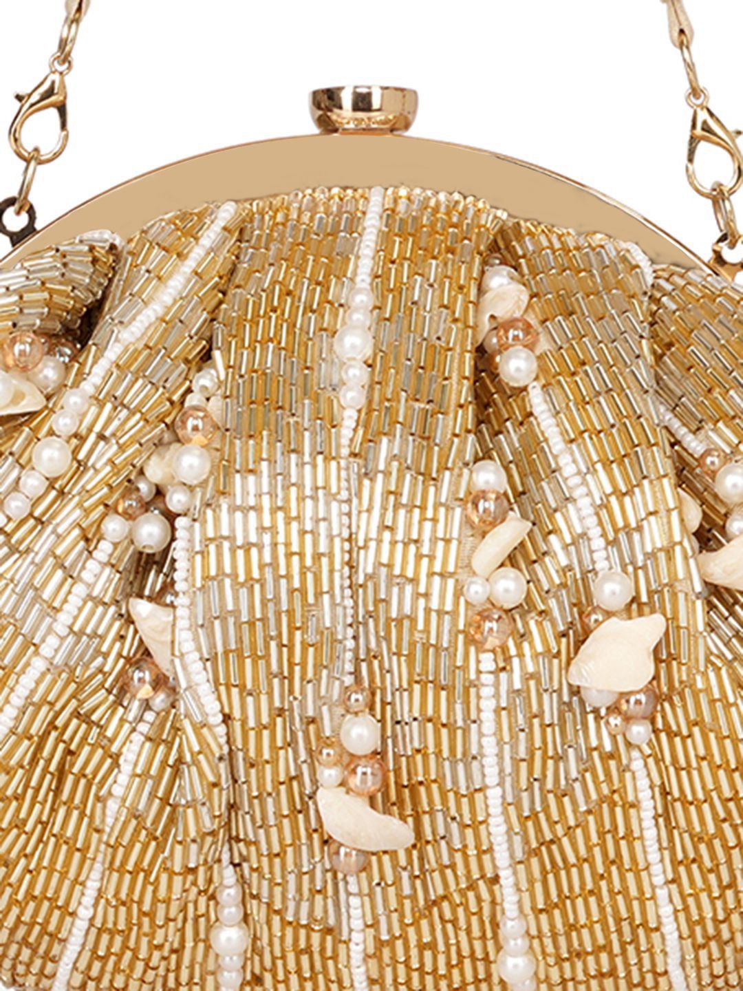 Graceful and refined, this half moon clutch features gold-toned embroidery with subtle pearl accents for a soft-glam finish. The sculptural silhouette opens with a secure twist closure to reveal a single main compartment, while the wrist loop ensures effortless carry. Perfect for wedding receptions, Diwali soirees, or bridesmaid gifting edits, it pairs beautifully with ivory lehengas, pastel sarees, or silk gowns to complete your look with shimmer and sophistication.