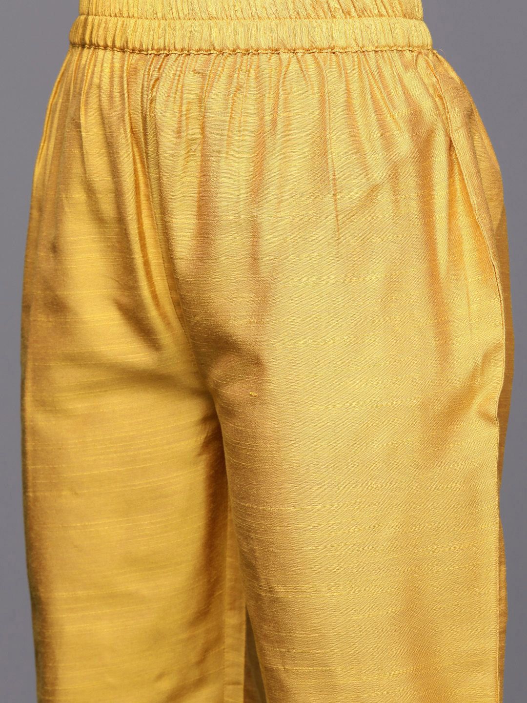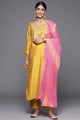 Solid yellow yoke embroidered regular sequinned straight Kurta with Trousers & With pink paing border Dupatta.