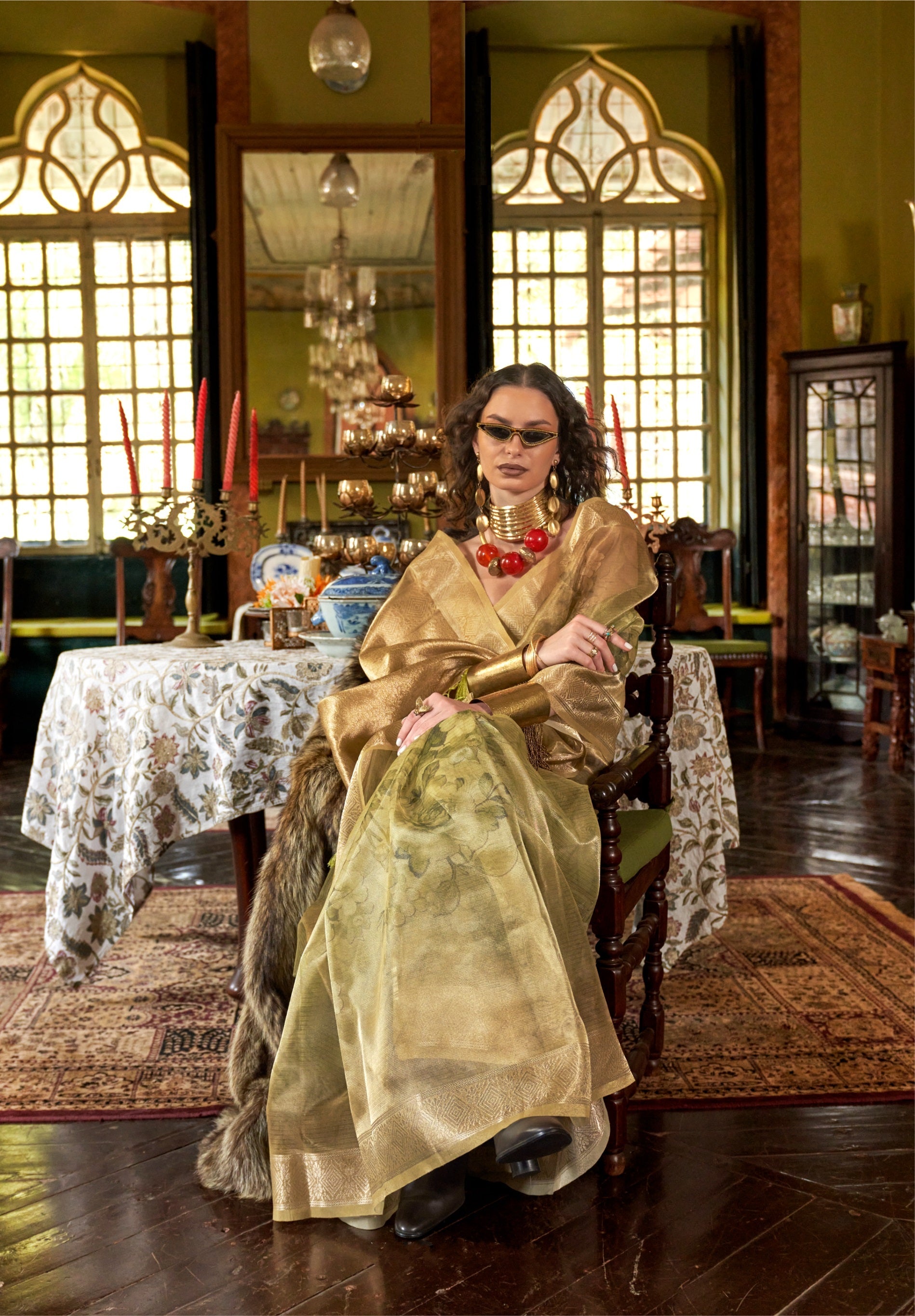 Dhiyona GR Women's Essence Fern Green Organza Woven Printed Saree