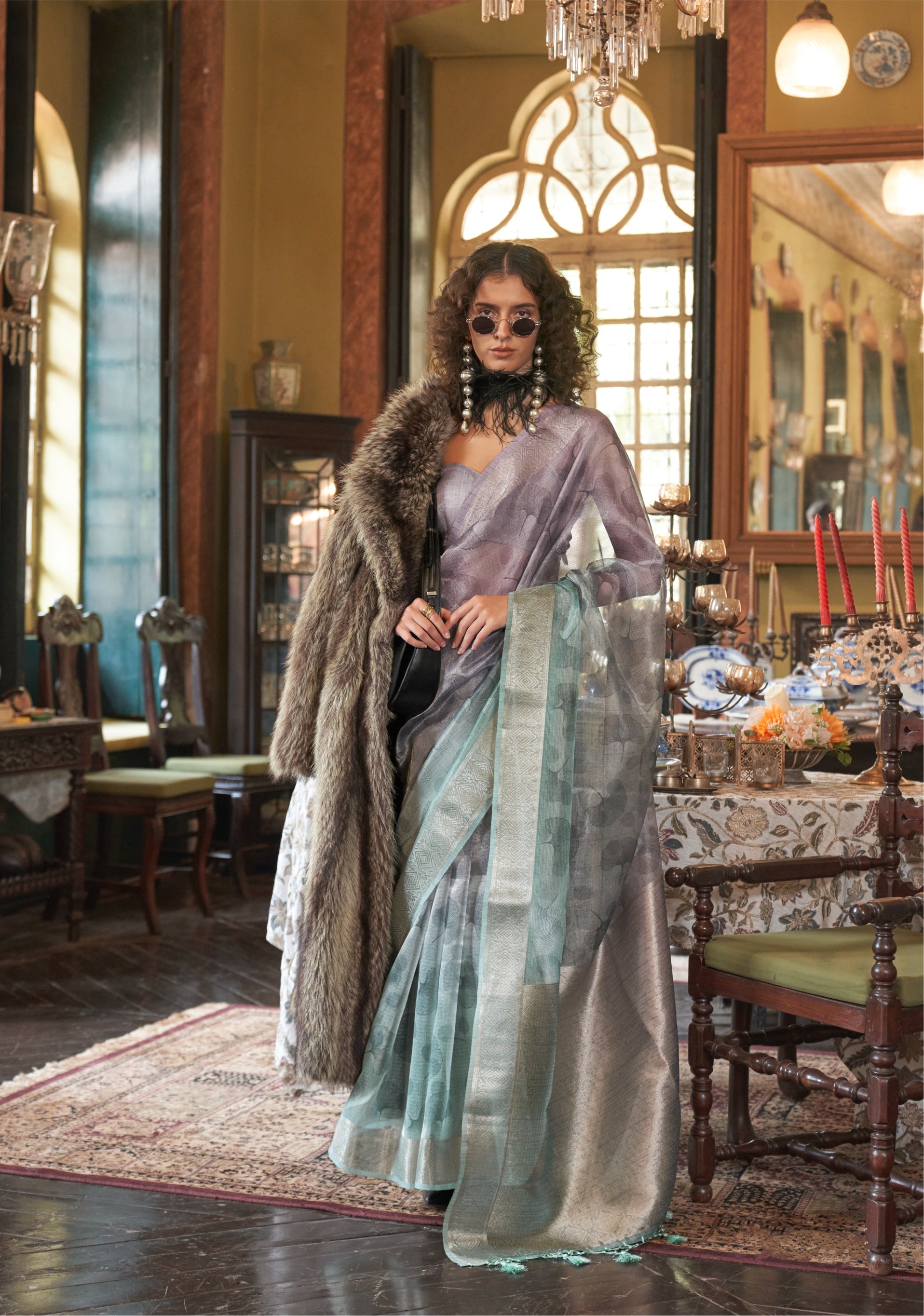 Dhiyona GR Women's Essence Teal & Smoke Grey Organza Woven Printed Saree