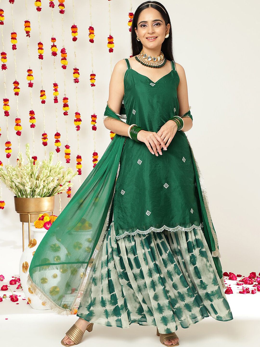 Green ethnic motifs embroidered kurta & sharara with dupatta