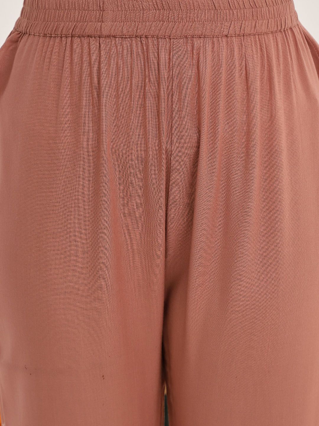 Peach-coloured, white embroidered kurta with trousers with dupatta